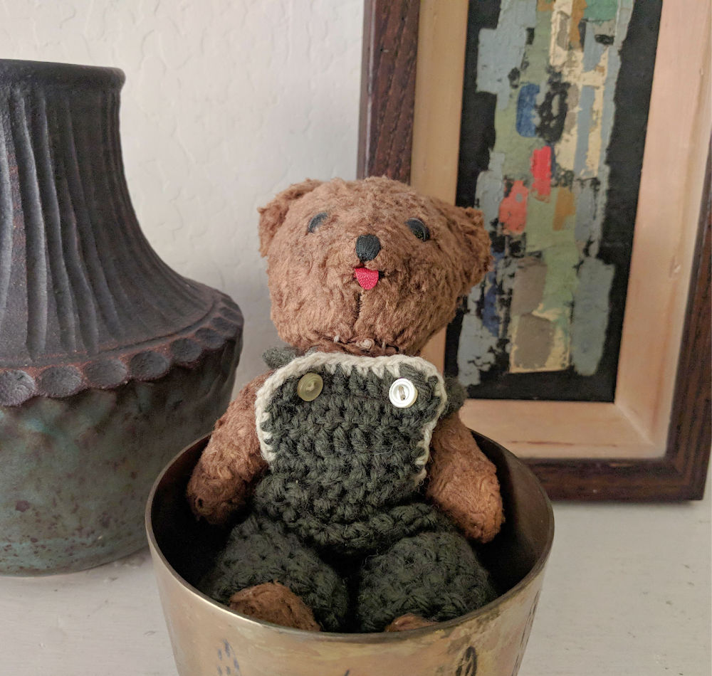 I have very few toys from my childhood but eight years ago I bought this vintage teddy bear for myself from another Etsy seller. No idea why except that he captured my heart. Now I need to find an ornament for him to hold!