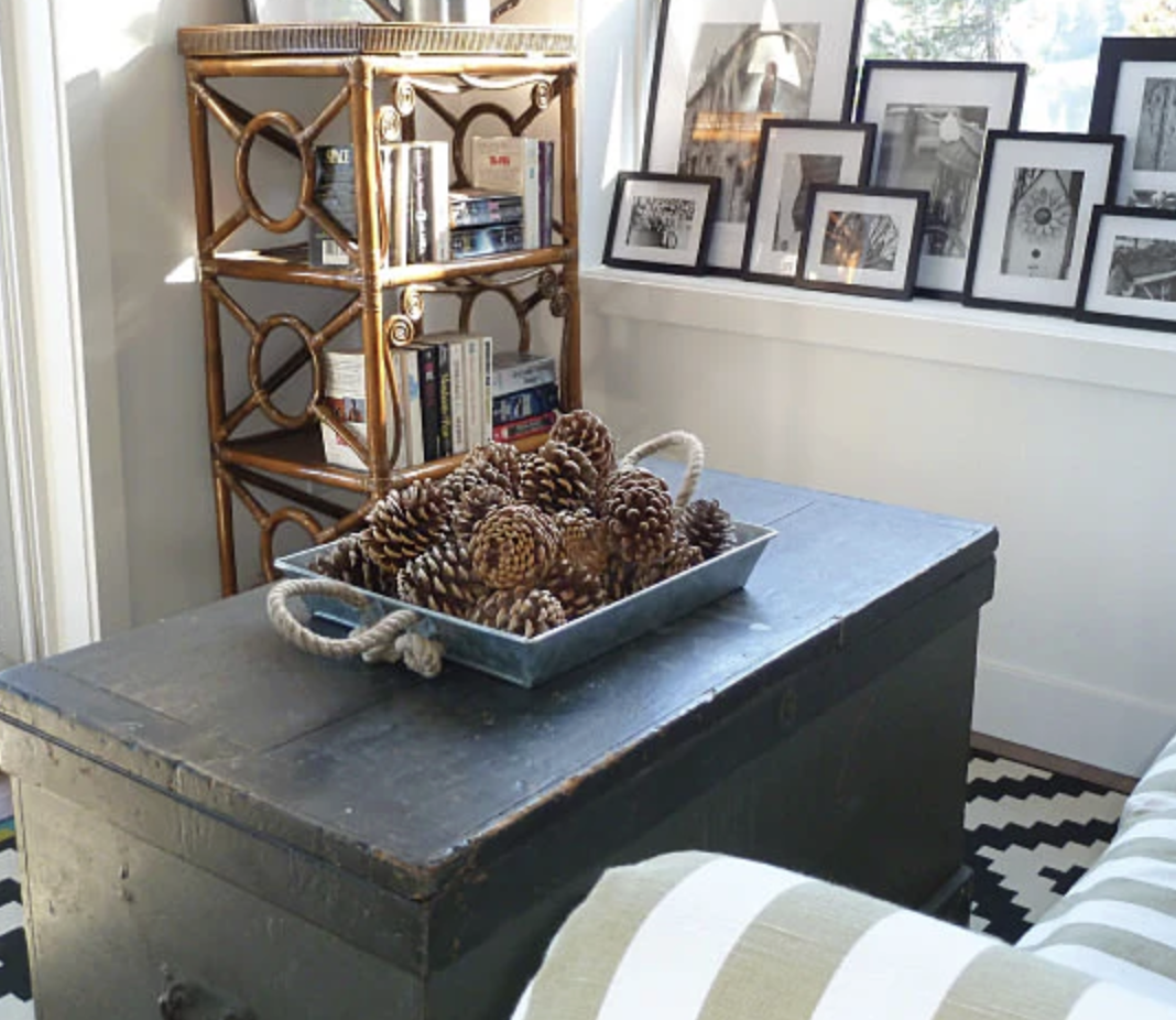 This heap of pinecones suits this room perfectly. You could add a few colorful glass ornaments or pine boughs to give it more flair.