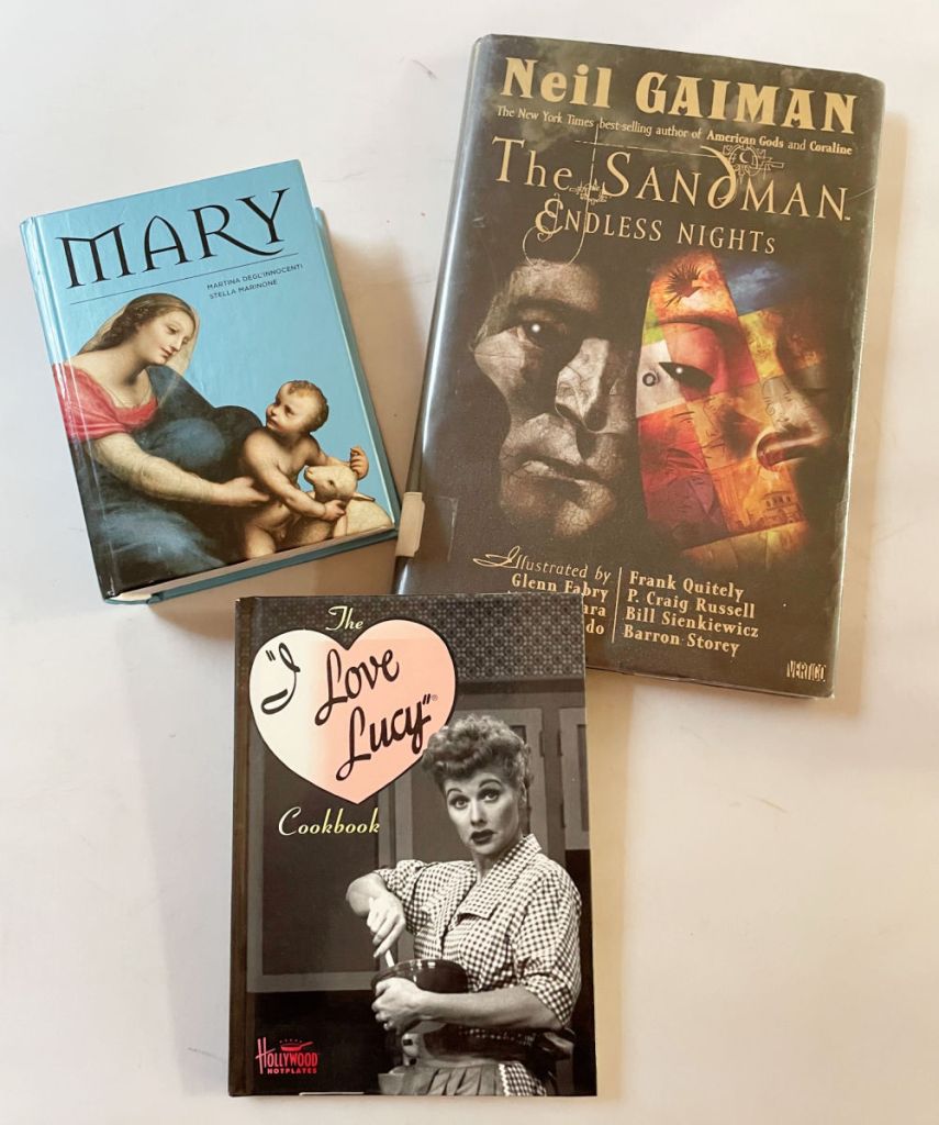 So these days I always peruse the book shelves. The other day I found an eclectic group that I decided to buy–from a thick, little book of stunning artwork of Mary to Neil Gaiman’s dark fantasy graphic novel (sadly an ex-library edition for which I paid too much) to a cookbook with Lucille O’Ball-inspired recipes.
