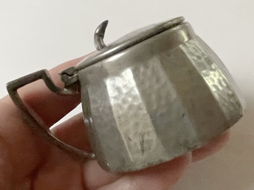 In June 2024 I bought a mini (1.5″) pewter jam pot (Civic Pewter, made in England) with a spoon for $2.39 at Goodwill. It was a charming thing and the glass liner was in perfect condition.