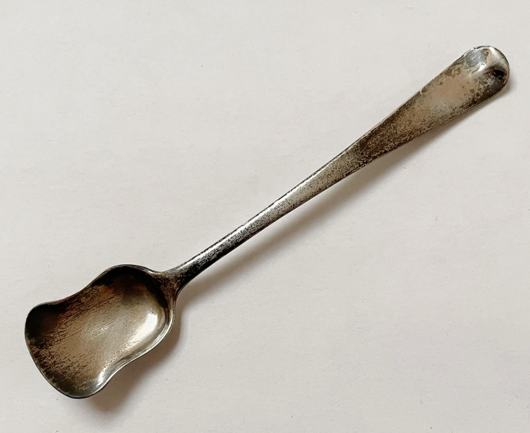 The spoon that came with the pot was not original to it, but an 1872 sterling silver one with a Victoria head!