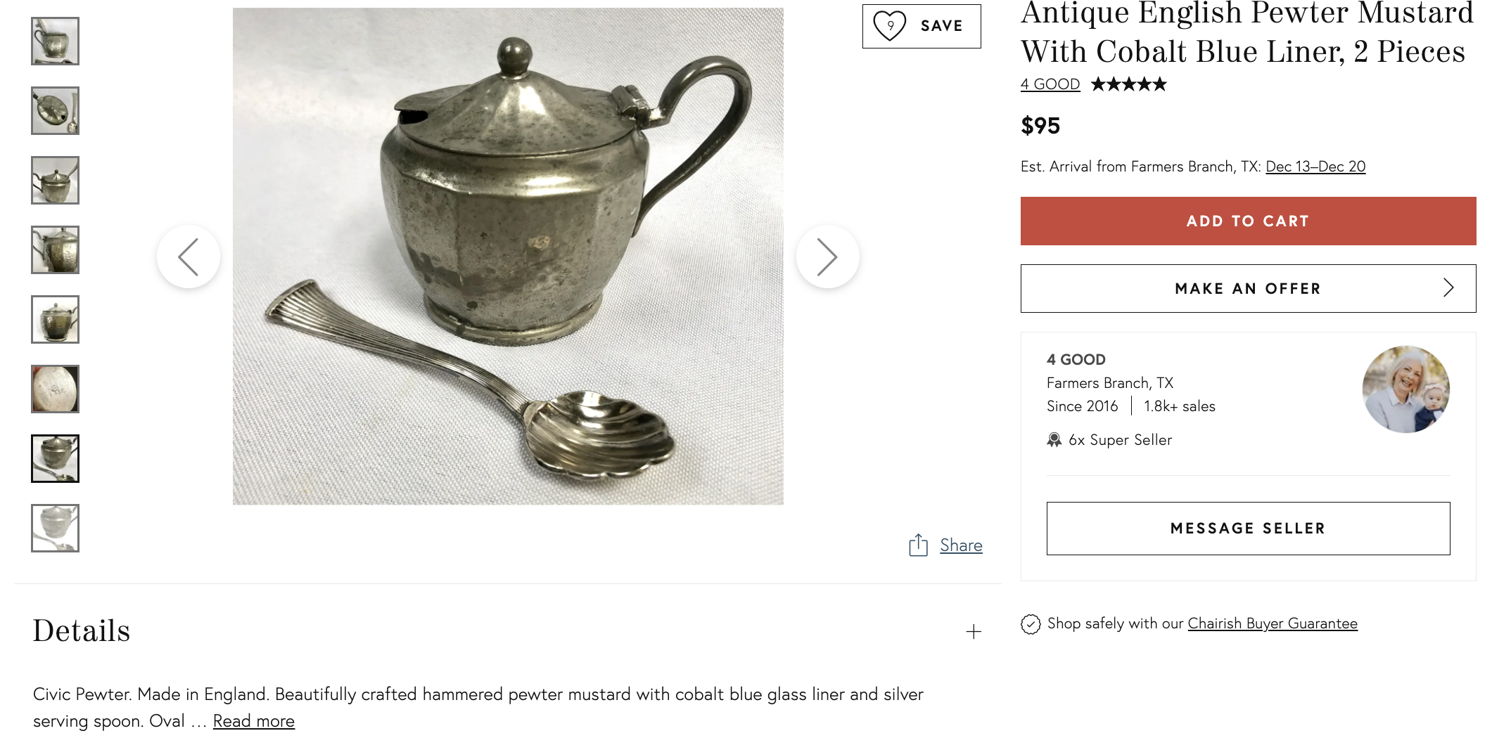 I did find a listing for a larger Civic Pewter jam pot with sterling spoon (also not original) for $95 on Chairish. Would my pot receive more attention and perhaps sell if I priced it higher? I’m not convinced.