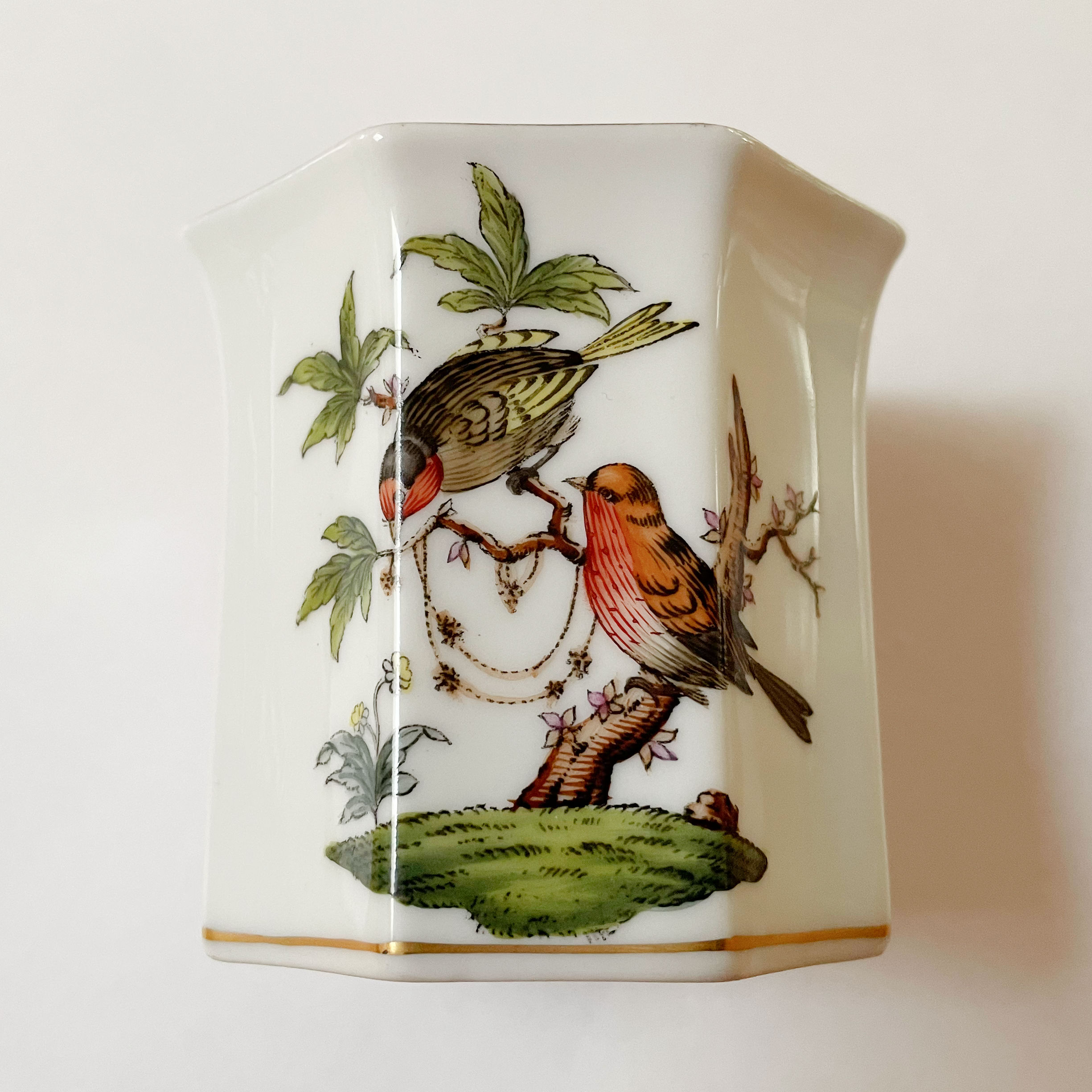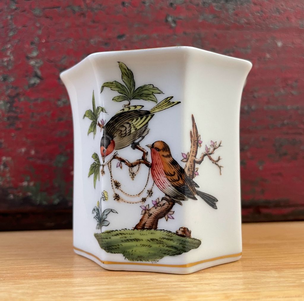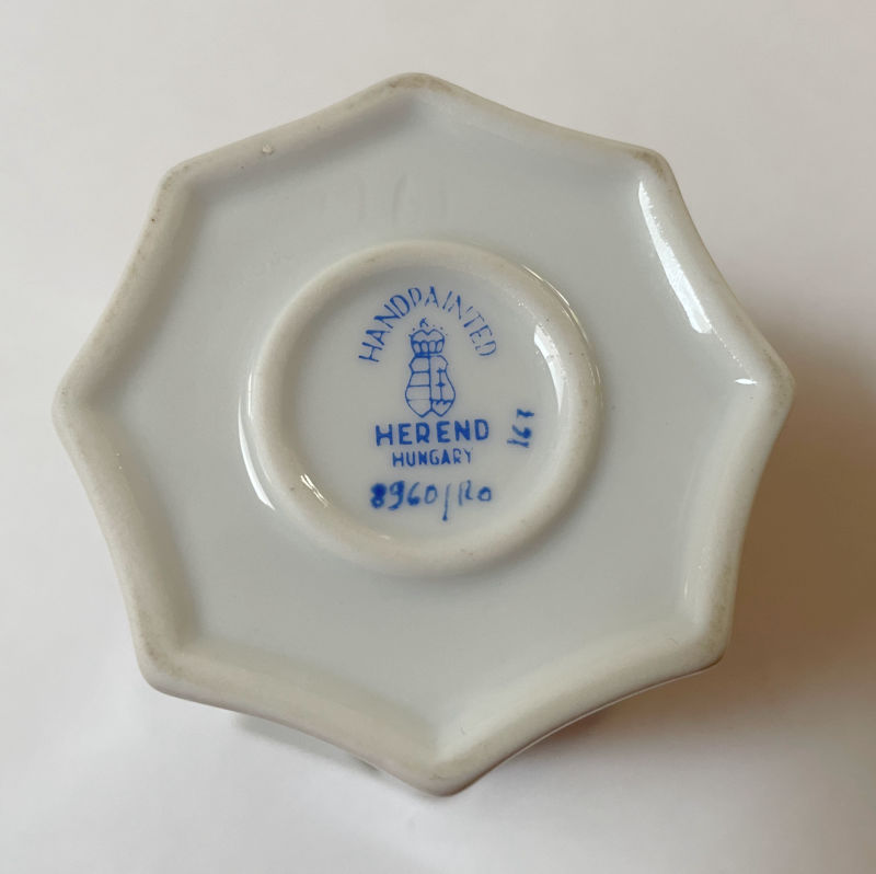 But Thursday I had an early morning dentist appointment so I had to pull myself together and afterwards I decided to hit up my neighborhood thrift store. (Hadn’t been in five days.) Walked in and saw a new merch cart. Gave it a cursory glance, wandered away and they came back a few minutes later. And that’s when I spotted this sweet little cup. Flipped it over and saw the Herend name. OMG, a piece of Herend for $2.50! Yes, please!!