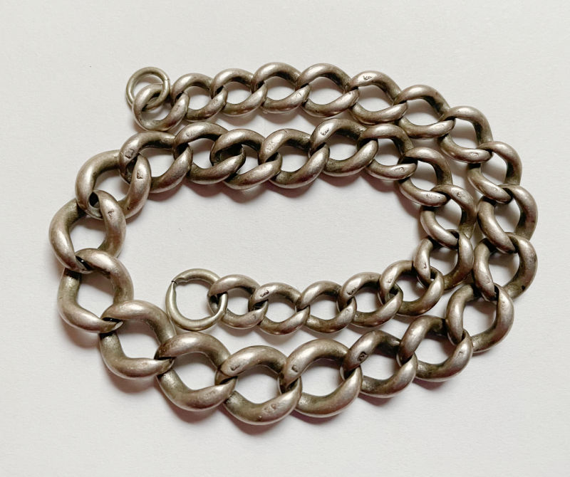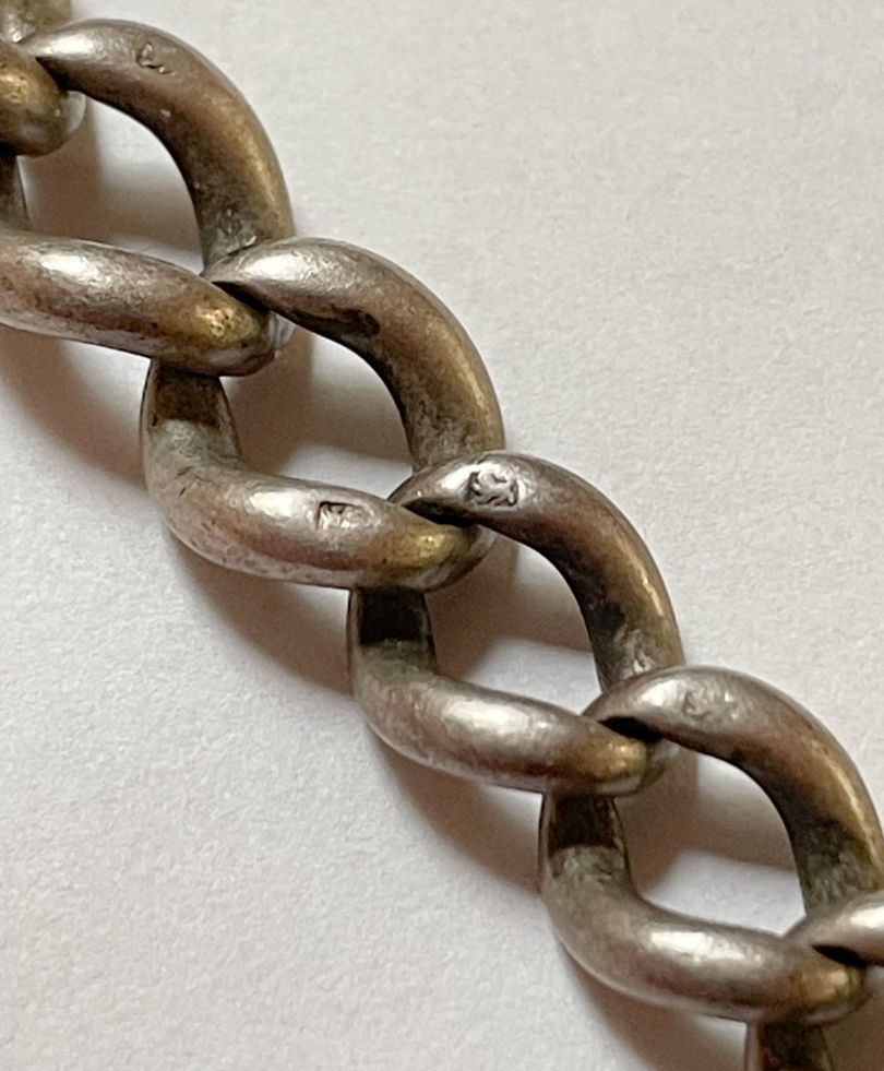 But the good news, on closer inspection each link had a tiny lion passant hallmark indicating sterling silver! This chain is likely circa late 1800s.