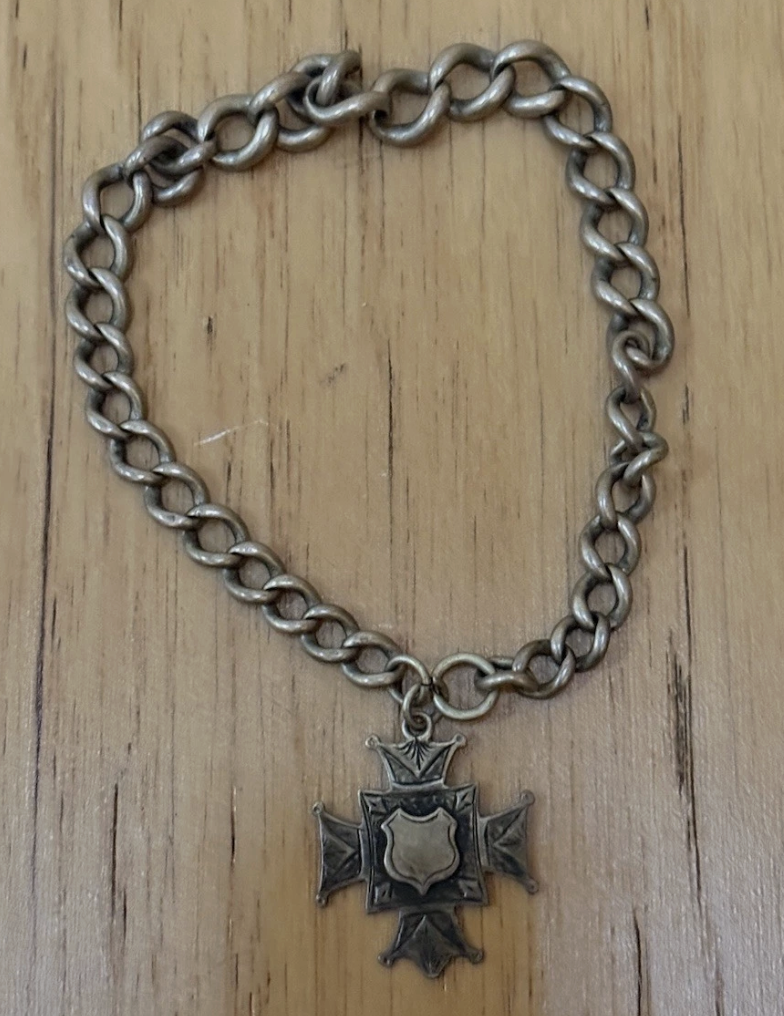 But here’s my surprise for this week. This item on ebay was listed as an “Antique Vintage Sterling Silver Pendant Medal Fob Shield Charm Bracelet.” Other than the weight of 33 grams, there were no measurements. The seller didn’t know for certain if the bracelet was even sterling silver because there were no markings on it but they thought it might be. It looked good to me so I decided to take a punt on it. Here’s one of their listing photos.