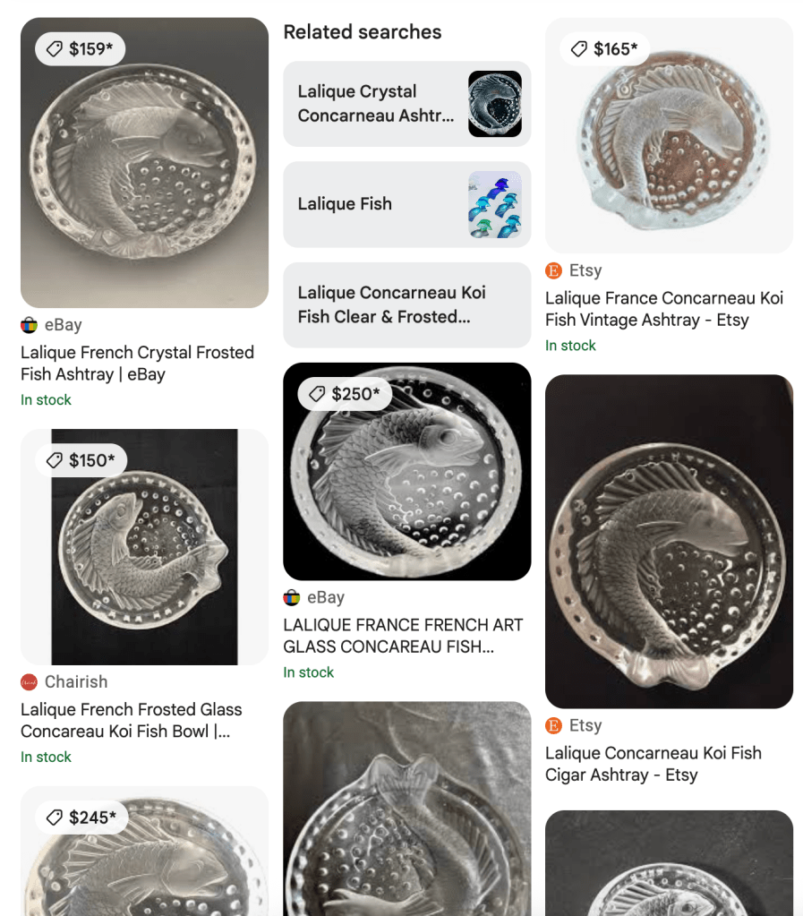 In the glass area I saw several nice cut crystal dishes, but these have been lingering for me too so I set them down. Then I saw this nicely made fish ashtray and it was signed. I couldn’t read the signature so I did an image lookup. Turns out it’s Lalique! Holy smokes! I have NEVER found Lalique in the wild before and had to constrain myself from doing a happy dance in the aisle.