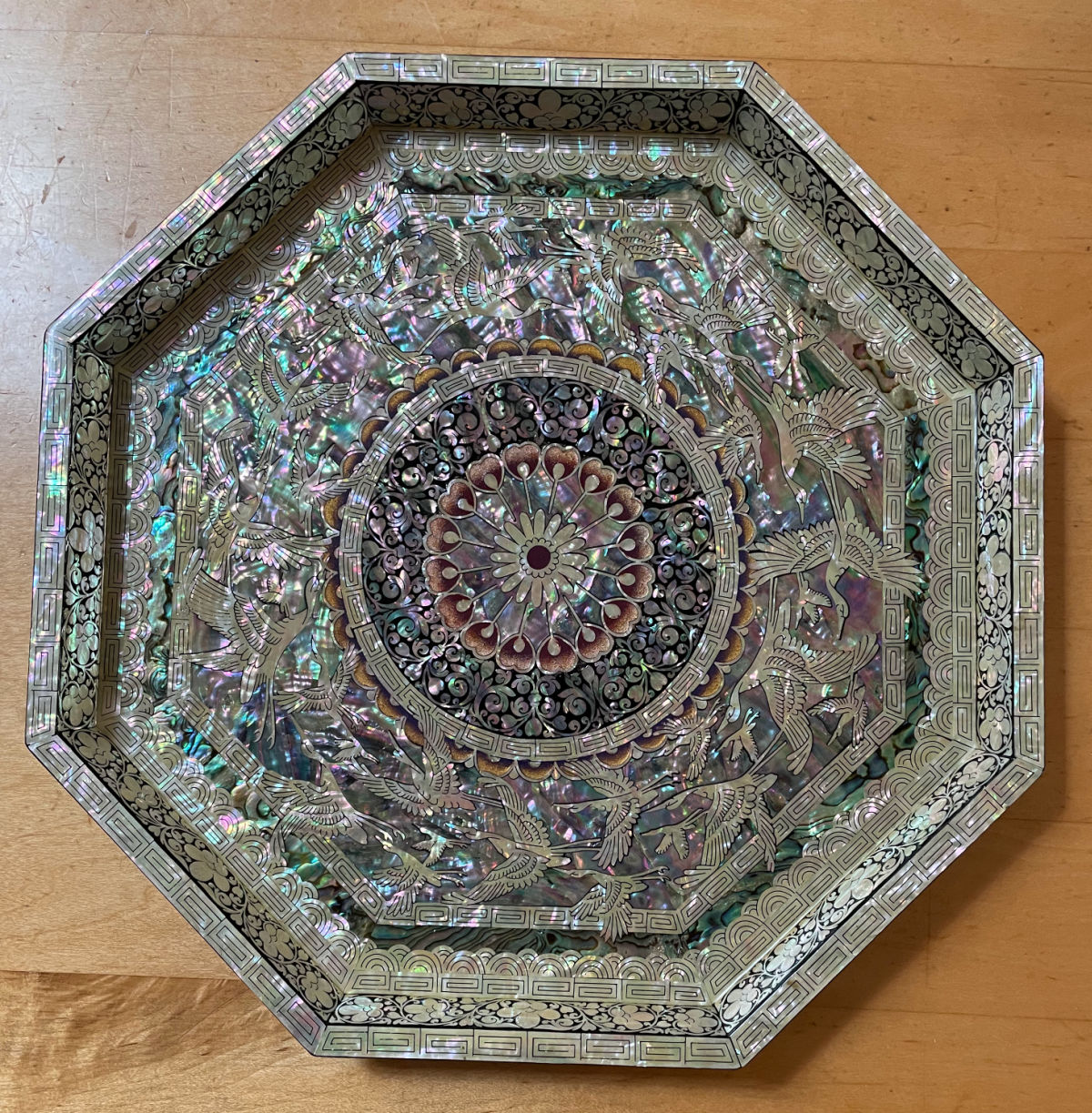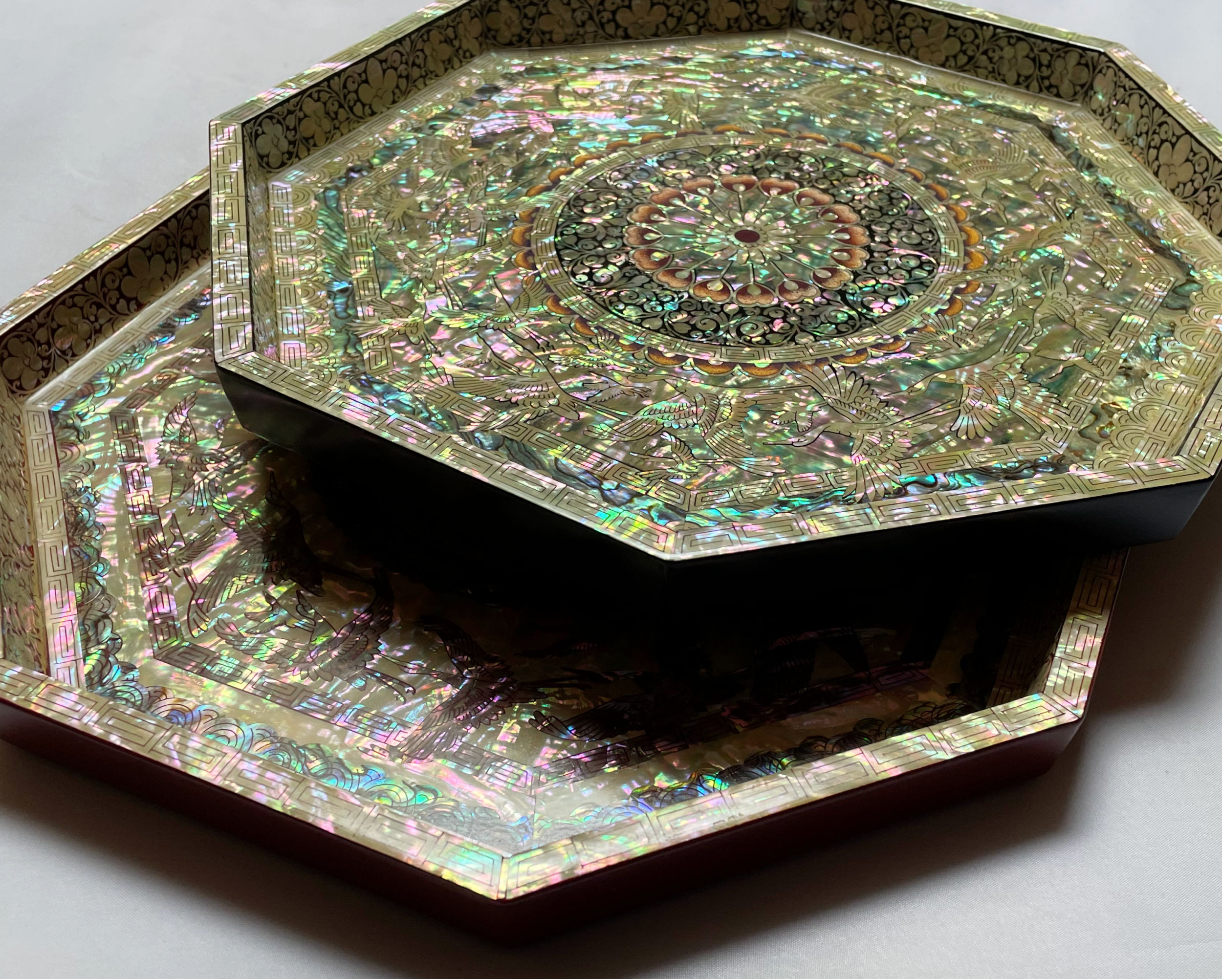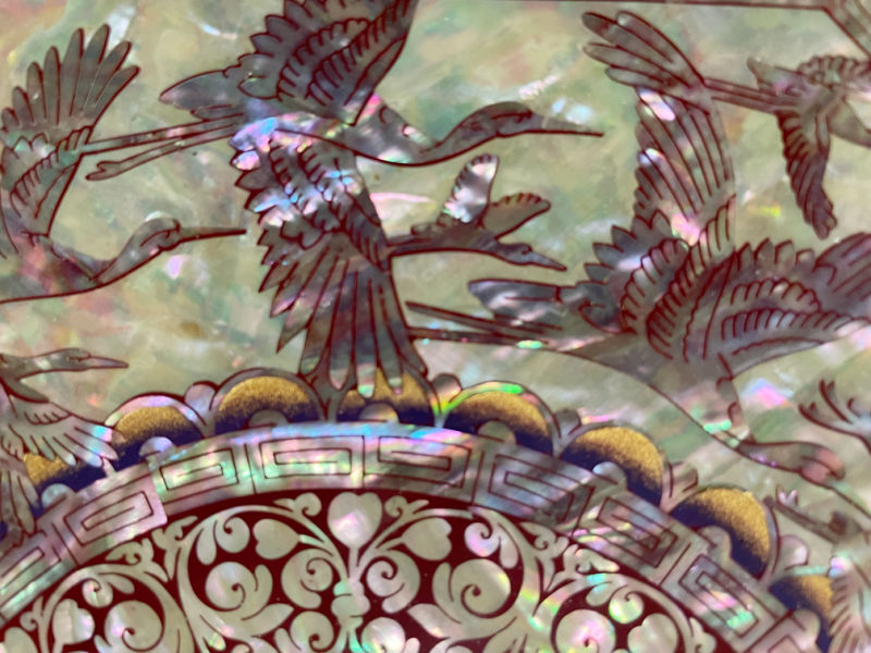 And a couple of days ago I found two gorgeous Korean trays with inlaid abalone shell–an art tradition known as najeonchilgi. The shell has amazing flashes of color and these trays, featuring flying cranes, are both usable and decorative. I’ve listed the pair for $100.