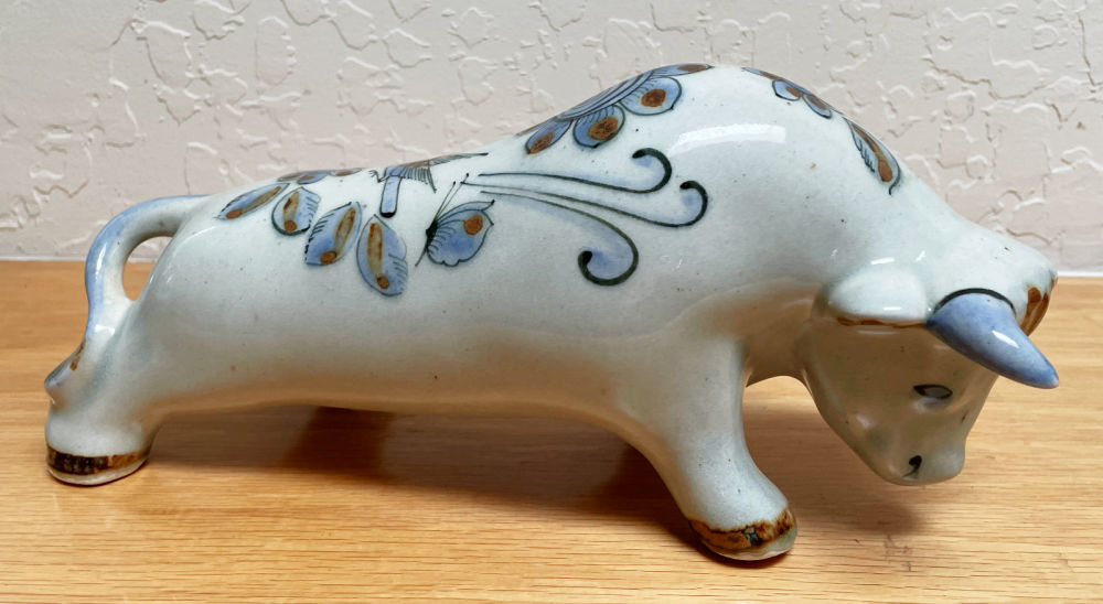 I had mixed feelings on the El Palomar Mexico ceramic bull. In my early store days I bought a lot of Mexican pottery pieces but after awhile they stopped selling for me. And I’m not into figurines. BUT a similar bull sold on ebay in November 2025 for $65. Currently others are listed online for $100 and $125. So I thought he was worth a try. I’ve listed mine for $75.
