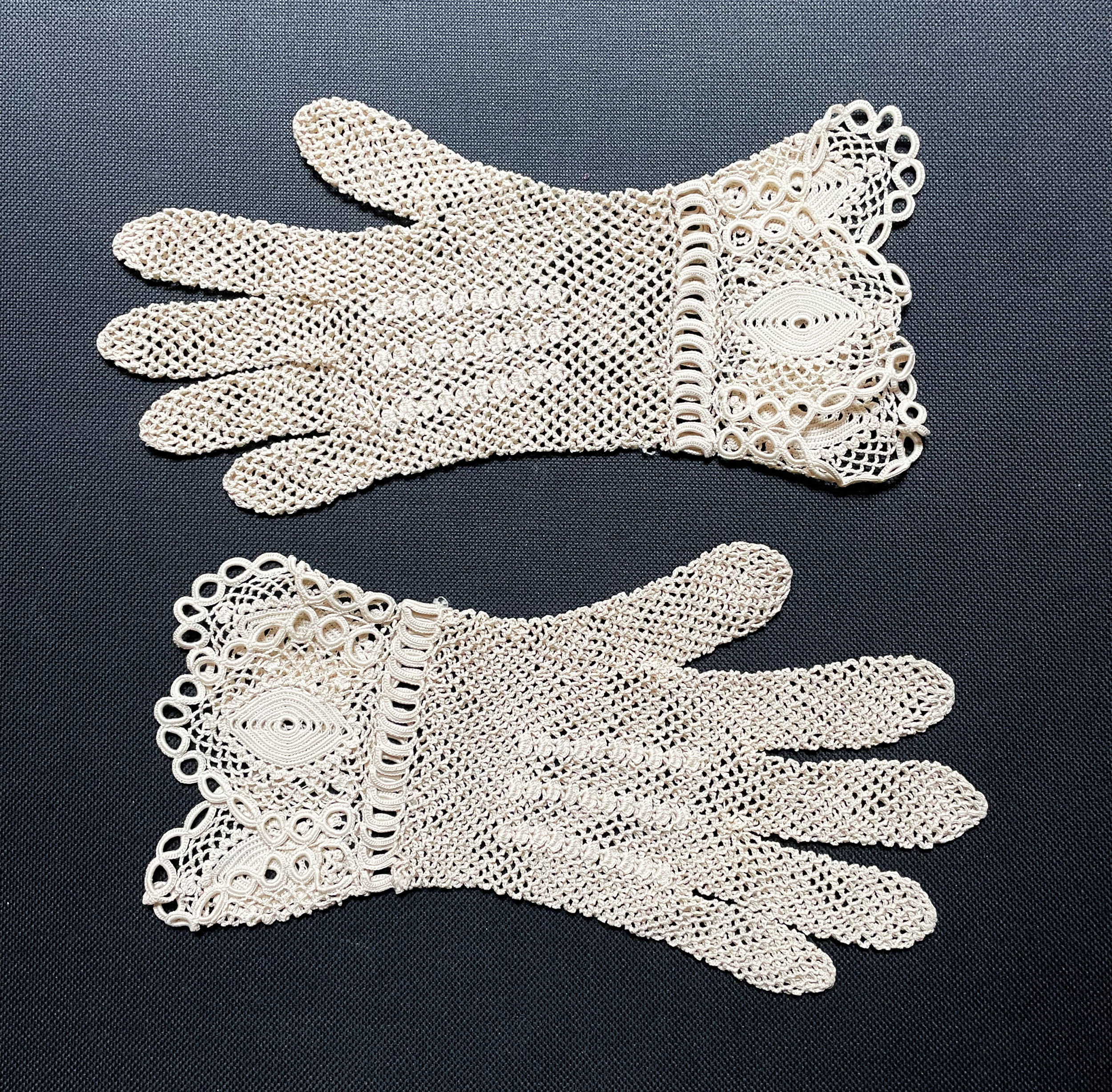 Years (and years) ago I had several pairs of vintage crocheted lace gloves in my store that went nowhere. Eventually I let the listings lapse but kept the gloves. I dug them out and while they do not “fit” my store’s direction, this pair in particular seemed quite nice, so I decided to give them another try.