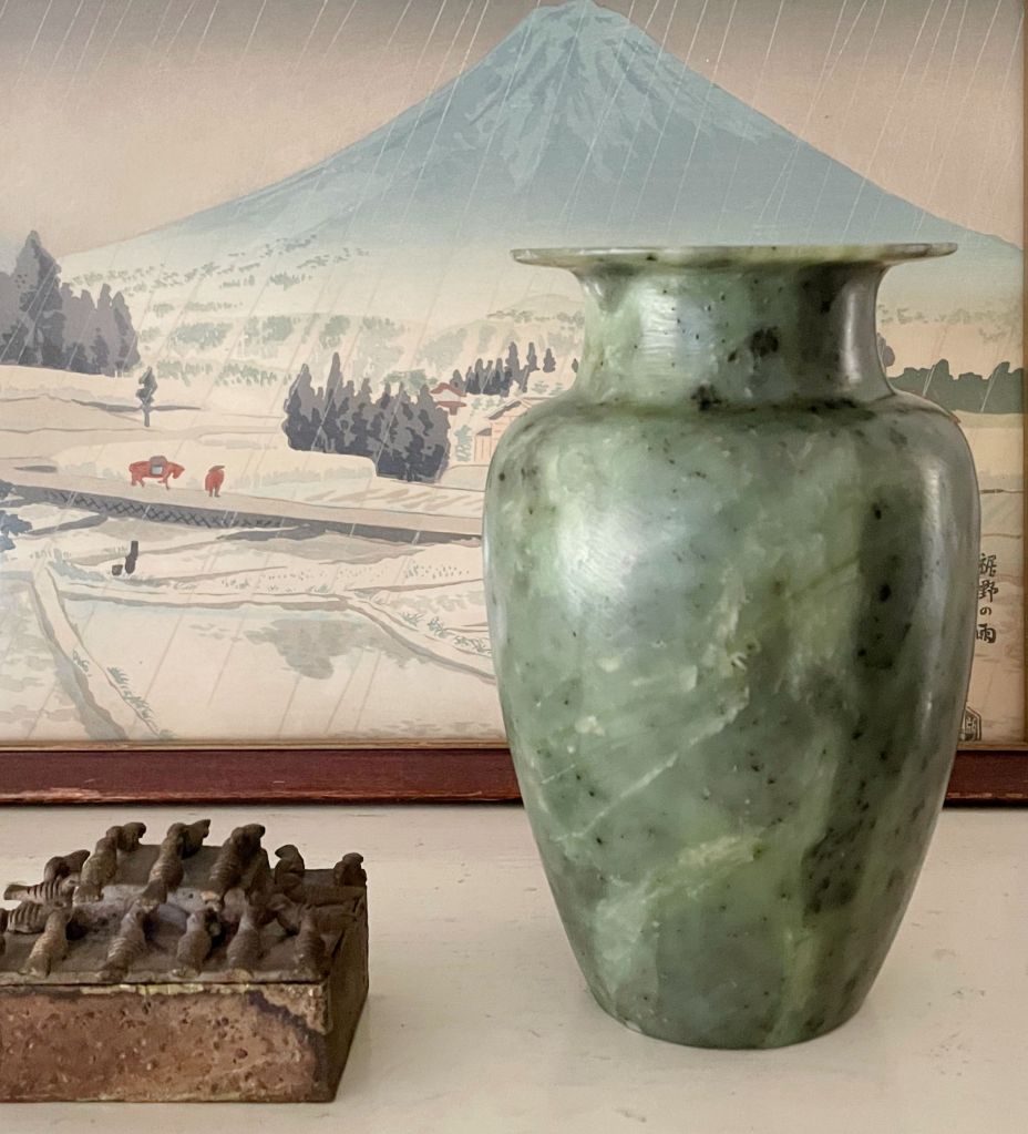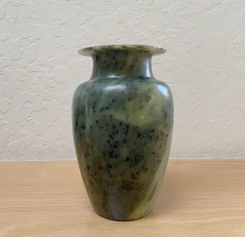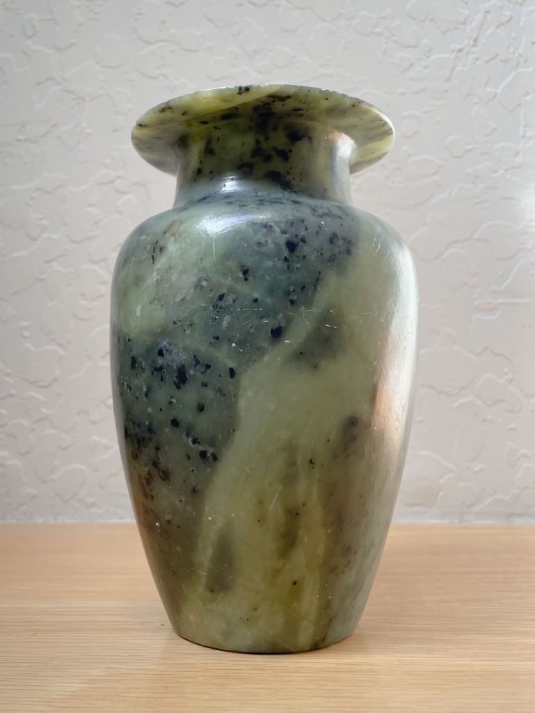 Well, I tried to see if my glass polish would help rub out the small marks. It didn’t do much to be honest. But as I researched polishing this type of stone I also discovered that conditioning it with wax was a thing professionals did. They prefer Renaissance Wax (created by the British Museum), but beeswax was recommended too. Well, golly, I had some beeswax that I have used on leather. I did a quick rub on and rub off on this vase and it came out beautifully!