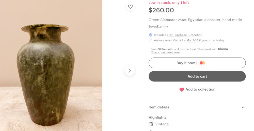 My last few thrifting visits to my neighborhood thrift store have not yielded anything exciting, but yesterday I found something–just one thing–a 7″ stone jar. I have done well with items made from natural stone in the past selling geode bookends, onyx vases, and marble wine coolers. (Something to look for when you’re out thrifting.)