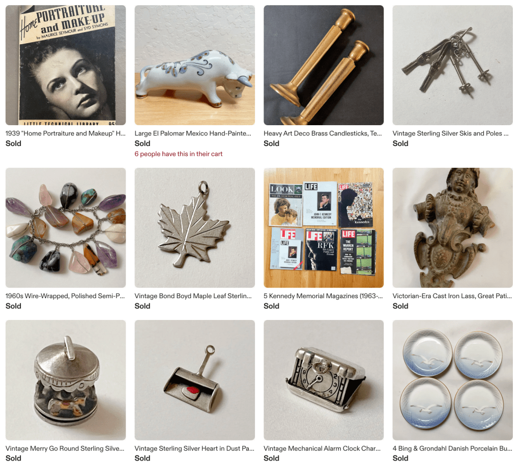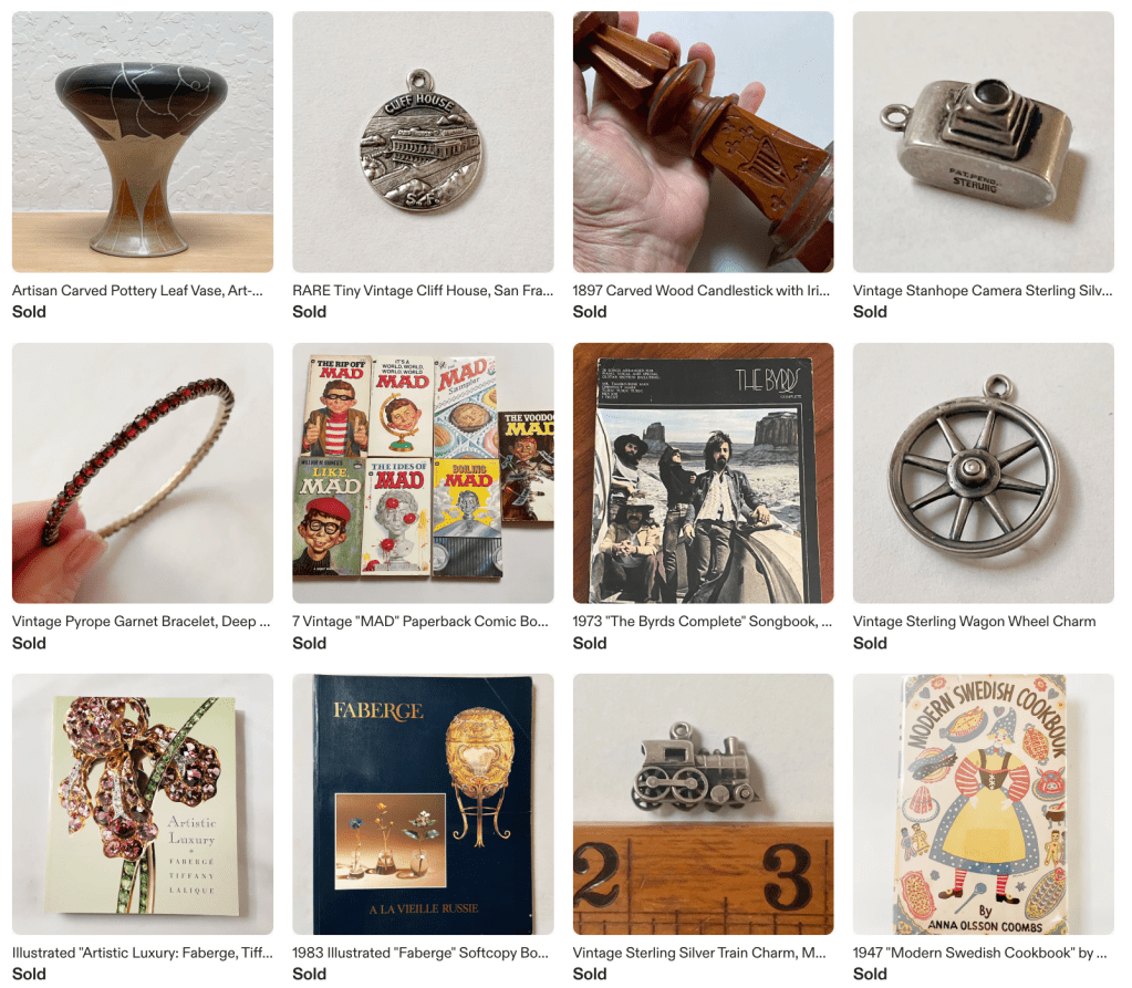 Sales and revenue wise, April has been a slightly better than average month. Here are a few recent sales which have been heavy on vintage silver charms and vintage books. The carved leaf studio pottery vase was definitely a long-tail item taking two+ years to sell. I paid $20 for it at the flea market and it sold for $75. The “MAD” paperbacks are not something I would source but these belonged to my husband and he wanted me to sell them. Vintage songbooks from groups can be surprisingly lucrative. This 1973 one from “The Byrds” sold for $58. (I paid $2 at an American Cancer Discovery thrift store.)