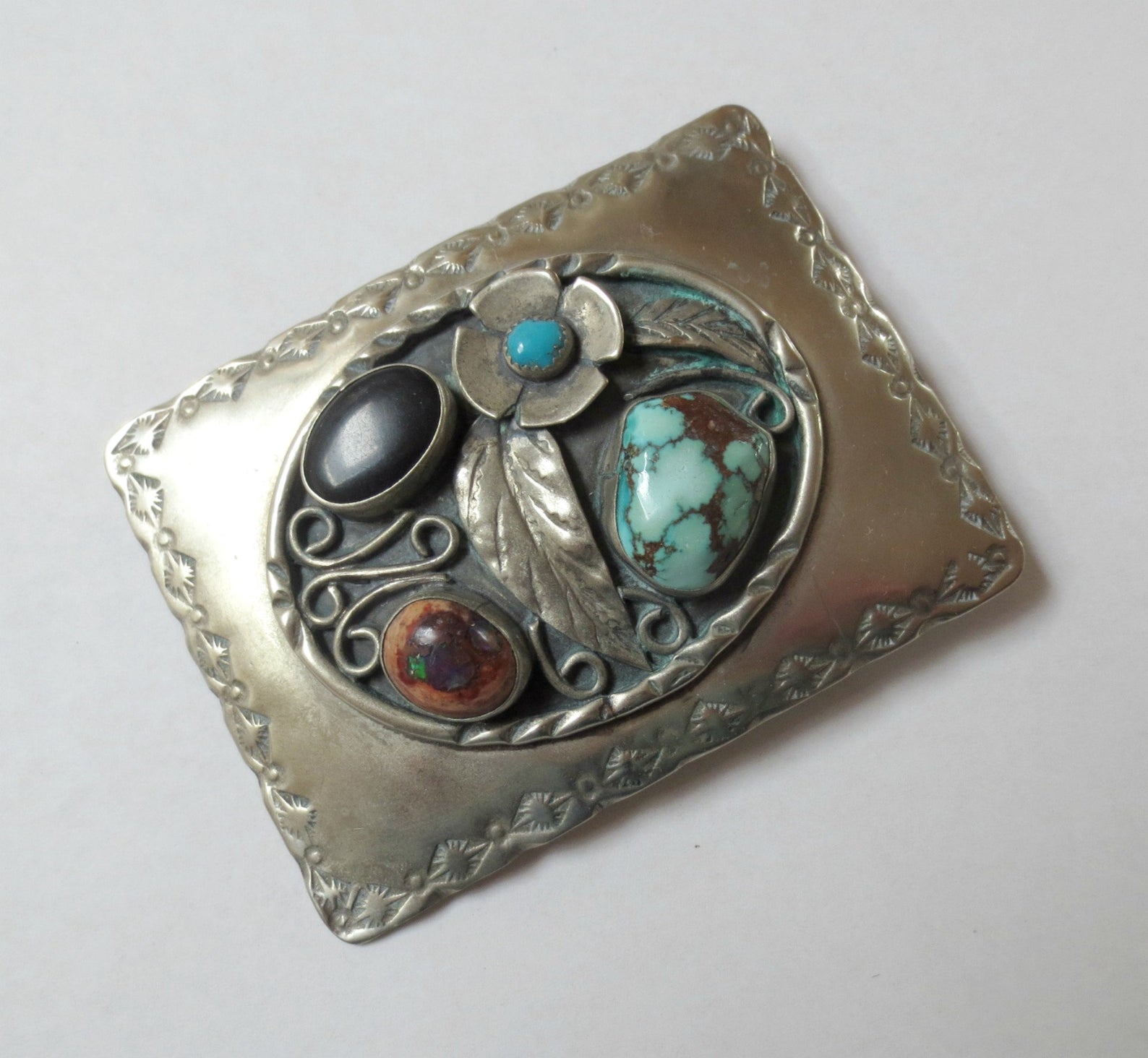 A beautiful, substantial sterling silver belt buckle with stone embellishments. (Material: Sterling, turquoise, fire opal, obsidian, Maker’s Mark: arrow, possibly Nathan Fred Jr., Weight: 79 grams, Size: 3.5″ by 2.6″, Condition: GOOD. Some light scratches and green corrosion as shown.) Price includes $10 US shipping with signature confirmation.