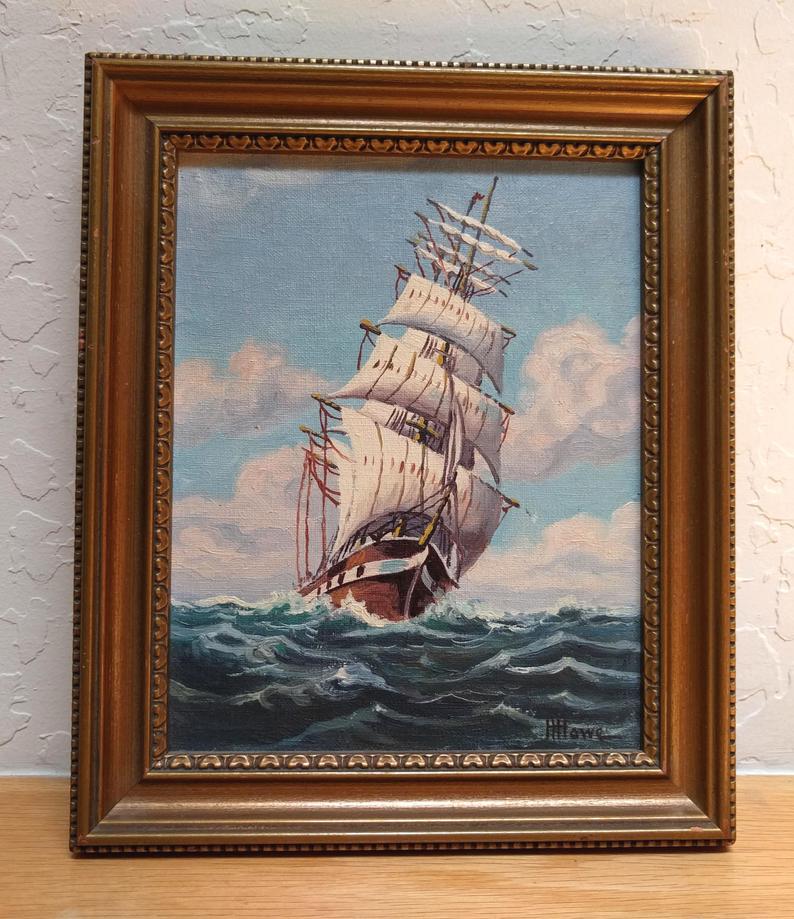 Harry Hambro Howe was a marine artist born August 16, 1886. The label on the back reads “Levi Woodbury, Built at Portsmouth, NH in 1851. Named after the Sect of the Navy in Pr. Andrew Jackson’s Cabinet.” (Signed: HHowe, Size: 9.75″ by 7.75″, Condition: GOOD. Paper on back is fragile and damaged. Painting has not been cleaned.) Price includes $20 US shipping with signature confirmation.